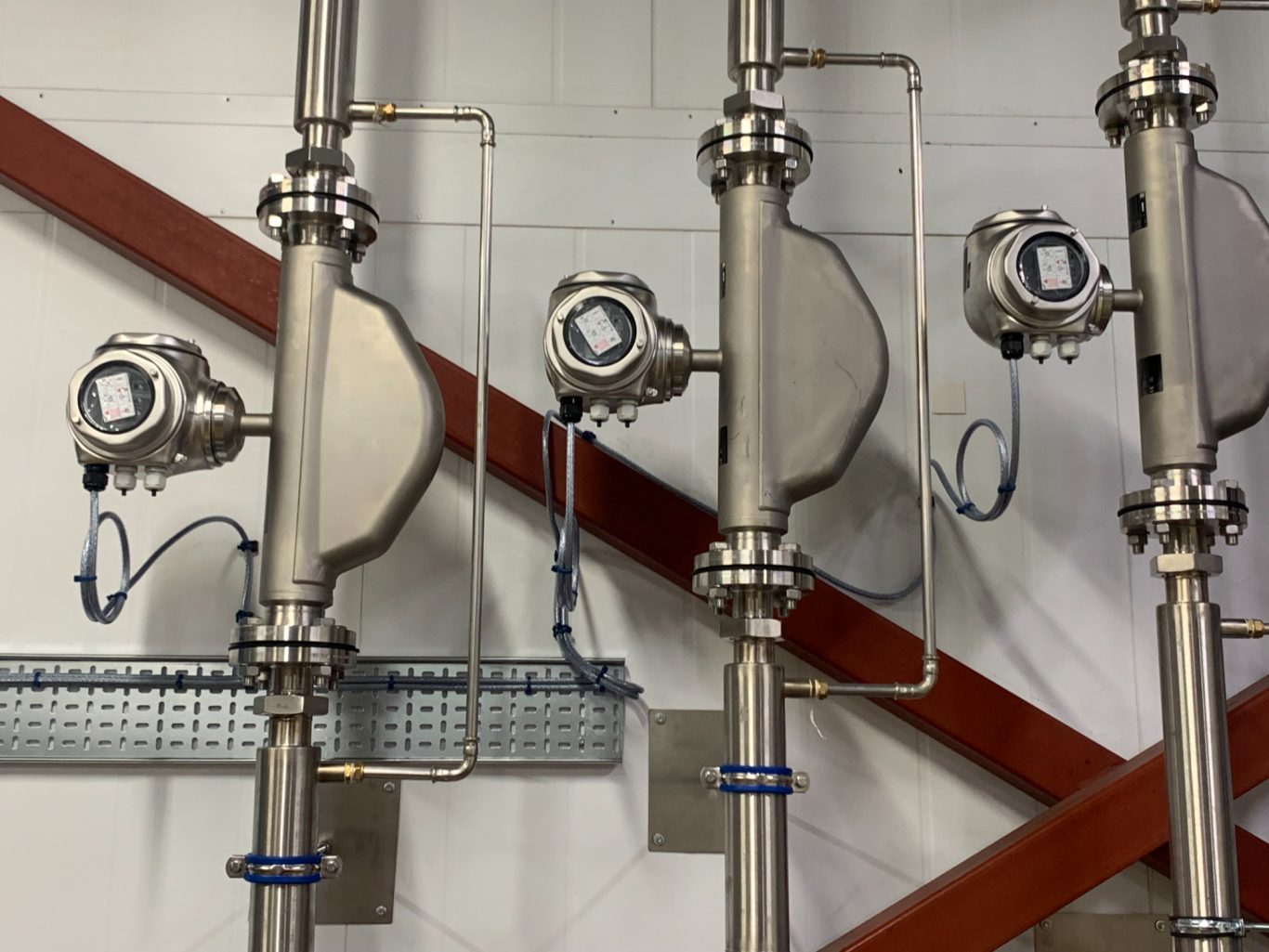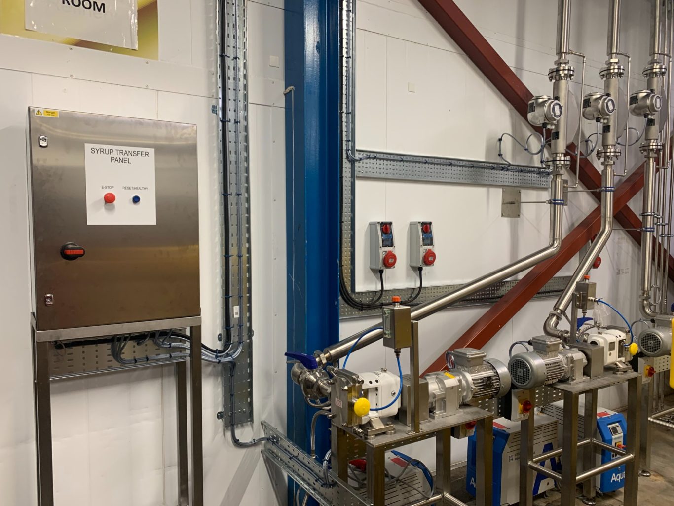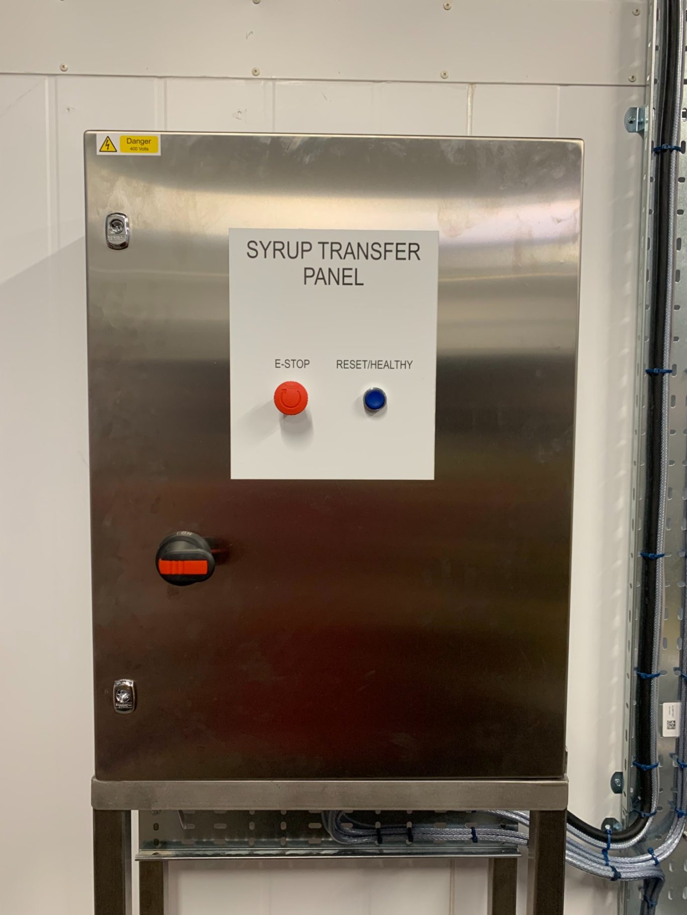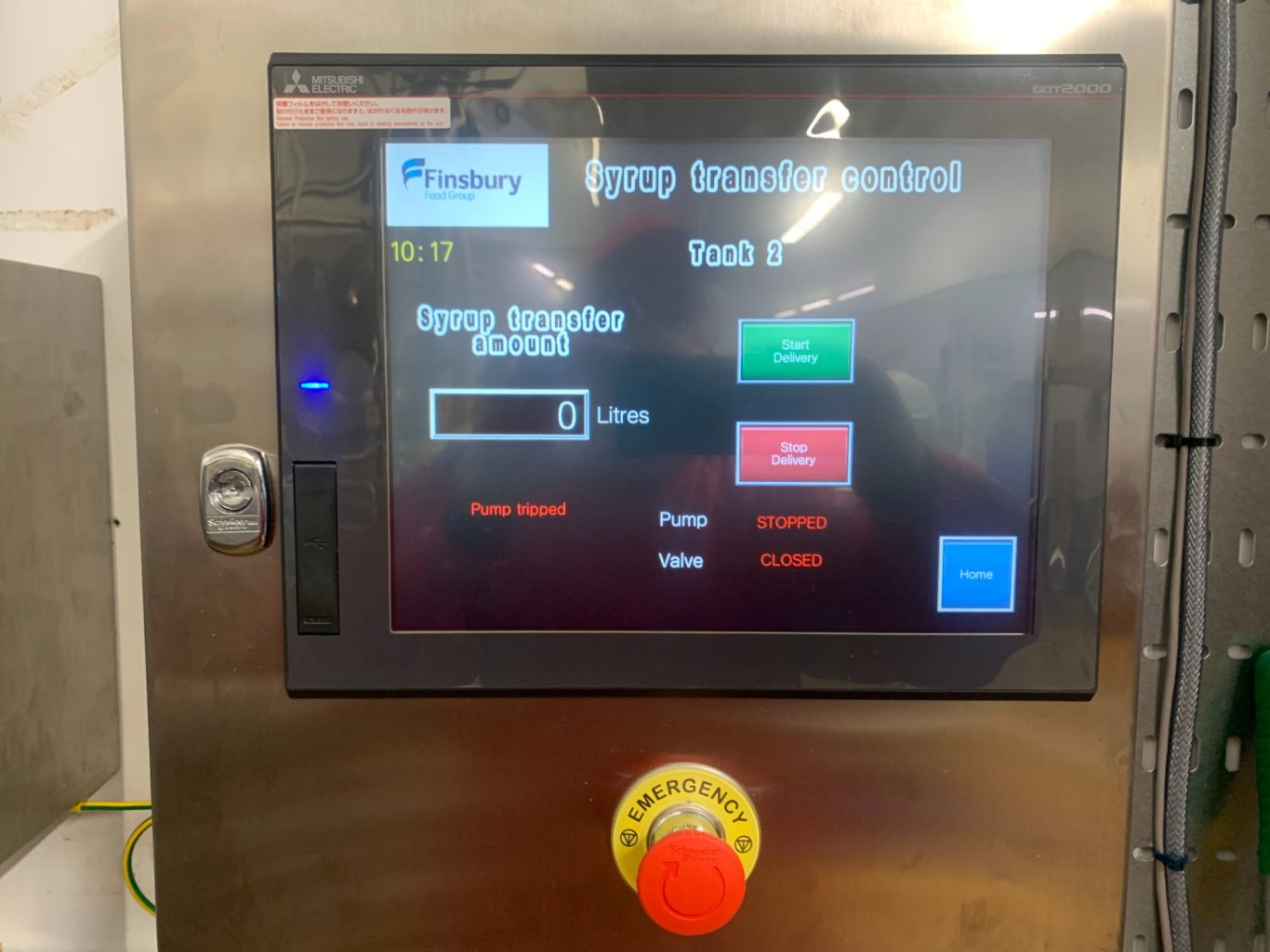 Using 3 Endress and hauser flow meters , we successfully installed a PLC control panel to control the pumps and valves and an HMI for the operators to use and enter in the desired value of syrup.